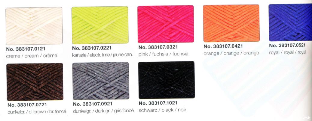 1 Knäuel wild wild wool 100 g 5% Schurwolle, 78% Polyacryl, 17% Polyamid