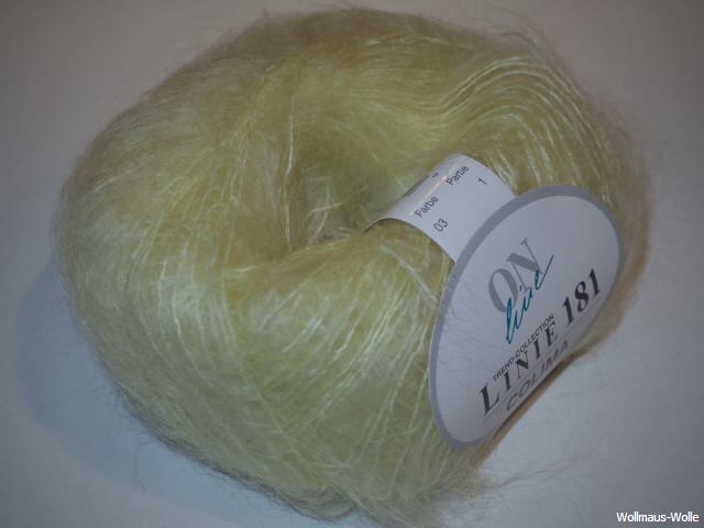Linie 181 Colima 80% Mohair, 20% Polyester Lauflänge 25 g - ca. 100 m, Nadel: 4,0 - 5,0 , Verbrauch (laut Hersteller) Gr. 38-40 ca. 300 g., Maschenprobe 10x10 cm: 19M-26R Knäuel a 25 g. Handwäsche